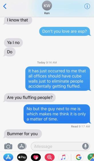 Because my universe was nice enough to provide me with an alternate wardrobe this morning, all should have been right with my world, but my try-to-get-over-it mood was killed by a caustic smell wafting by me. What. The. Hell. I work in an open-office space at a nonprofit organization whose mission is to amplify love, hope, and compassion. They couldn’t afford huge, modular, walled workspaces so they improvised with little kitchen-table-style desks lined up in rows, which leaves no room for privacy or anything. I casually texted my husband to vent about the wafting [the esp part of the text is a story for another time]: